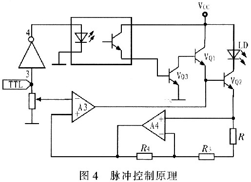 根據上述設計思想設計脈沖控制接口電路,其原理圖如圖4所示。由非門單元,晶體管VQ3,光電耦合器組成。當脈沖為高電平時,非門輸出低電壓,使光電耦合器截止,光電耦合器輸出低電平,使晶體管VQ3截止,VQ3集電極輸出高電平使VQ1、VQ2導通,LD正常工作;反之,光電耦合器導通,使VQ3導通,VQ3集電極輸出低電平,使VQl、VQ2截止,LD不工作。在沒有外控脈沖控制信號時,接口懸空,非門輸入高電平,輸出低電壓,光電耦合器不工作,晶體管VQ3截止,VQ3集電極為高電平,使VQ1導通,保證LD的正常連續(xù)發(fā)光。