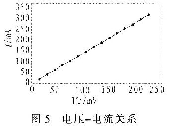 表1是該電路驅動波長650 nm,功率200 mW的LD連續(xù)工作時,基準電壓與輸出電流的測試結果,其電壓-電流關系如圖5所示。