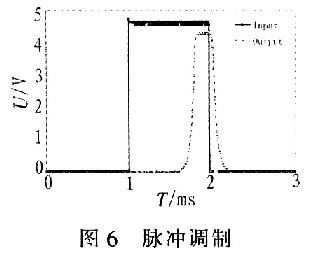 圖6顯示了該驅動電源輸出的脈沖波形。曲線Input為輸入控制脈沖信號,曲線Output為LD上電壓脈沖。結果表明:LD上電壓脈沖的上升和下降時間都很短,中間段電壓的穩(wěn)定使輸出電流恒定,恒定的電流幅度保證了LD輸出功率的穩(wěn)定。通過改變輸入脈沖的頻率、脈寬,可得到所需的LD激光脈沖信號。