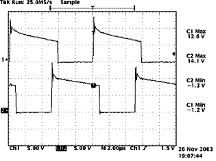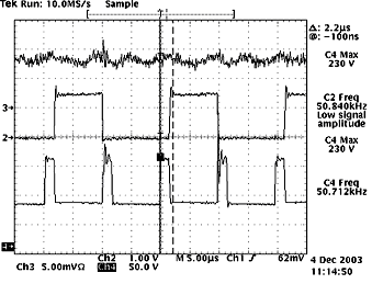 (b)圖中,示意了隔離變壓器副邊輸出的兩路驅(qū)動(dòng)波形,可以直接驅(qū)動(dòng)開(kāi)關(guān)管。從圖中可以看出驅(qū)動(dòng)波形比較理想:有快速的上升沿,并在一開(kāi)始有一定的過(guò)沖,可以加速開(kāi)通,減小了開(kāi)通損耗;同時(shí),有反偏截止電壓,提供了足夠的反相門極驅(qū)動(dòng),減小了下降時(shí)間;很好地驗(yàn)證了驅(qū)動(dòng)電路的設(shè)計(jì)是合理的。