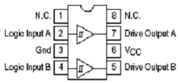 MC34152的外圍電路簡(jiǎn)單,應(yīng)用方便。它是8管腳的同相推挽驅(qū)動(dòng)芯片,具體的內(nèi)部結(jié)構(gòu)和封裝如圖4所示。2,4腳為兩路控制信號(hào)輸入,經(jīng)過(guò)芯片內(nèi)部的推挽放大,直接輸出同相的兩路驅(qū)動(dòng)信號(hào)(7,5腳)。為使芯片更加穩(wěn)定地工作,一般在芯片的電源端并聯(lián)一個(gè)濾去高頻干擾的瓷片電容和一個(gè)濾去低頻干擾的電解電容。