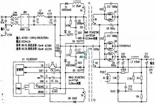 整機(jī)電路見下圖。交流電源經(jīng)共模扼流圈Lcm后被BD1整流;L1和C1、C2組成竹型濾波(C1、C2的容量非常小,濾波后仍為脈動(dòng)波形);PT用于抑制浪涌電流。整流濾波后的脈動(dòng)直流電壓一路經(jīng)變壓器T1的初級(jí)繞組和二極管D3被IC1中的場(chǎng)效應(yīng)管開、關(guān)。從T1次級(jí)繞組經(jīng)D7輸出脈動(dòng)直流電壓。