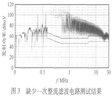 缺少一次整流濾波電路的測試結(jié)果如圖3所示,從圖3可以看出, 這個超標的頻率點不是單一的而是覆蓋了整個頻段。為了濾除這些干擾, 將電流的畸變減小到最小, 就需要在整流過后增加一級濾波電路。