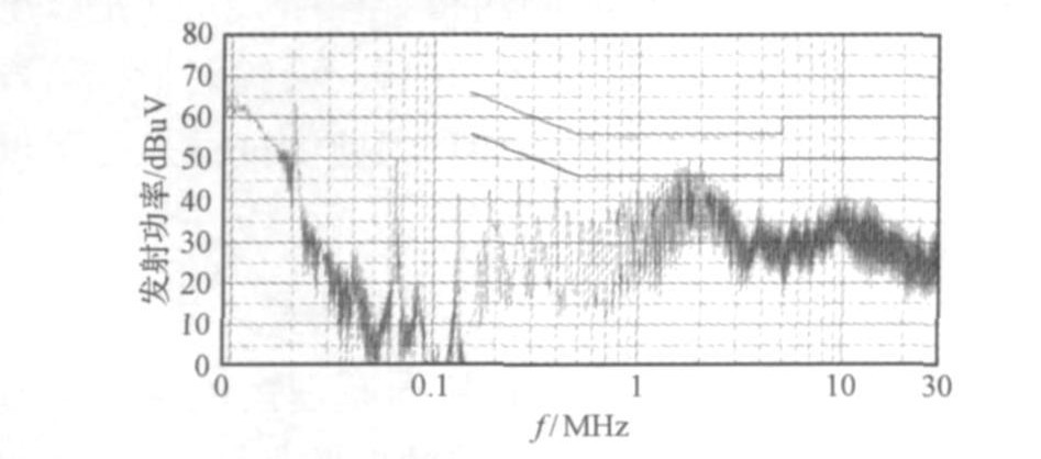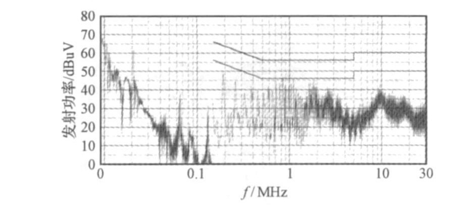 一鎳氫電池充電器產(chǎn)品, 額定功率5W.在其出廠前, 用實驗室設備(人工電源網(wǎng)絡為PMM L2??16A,EM I接收機為PMM9010) 對其進行預測試, 采用的測試標準為GB55014,,其結(jié)果如圖4所示。