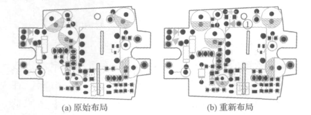 從圖4中可以看出在2 MH z頻率點附近最大超出為5 dBuV.為保證能夠順利通過認證機構(gòu)的實驗室測試, 一般要求預測試結(jié)果比標準限制低2 dBuV,希望盡量能夠比標準限值低6 dBuV.所以從圖4可知該產(chǎn)品的預測試結(jié)果并不理想。初步分析測試圖,可能性最大的原因是開關(guān)管工作時產(chǎn)生的干擾把2MH z頻率點附近的噪聲電平底部懸空, 從而把傳導干擾的電平抬高。而在傳導發(fā)射測試中, 1 MH z~2MH z的頻率信號干擾是由共模電流產(chǎn)生的占主要分量[ 10] .所以初步定性為電流回路對參考地形成的干擾信號。為了能夠一次性解決問題以達到標準限值要求, 把可能出現(xiàn)問題的地方都加以改進, 本研究提出了解決方案: ①按照上述措施對線路板進行重新布局, 原始布局如圖5( a)所示, 圖中布局雖然按照主電流流向排布, 但缺乏考慮各個子路之間的相互關(guān)系。重新布局如圖5( b)所示, 在無法改變PCB板的結(jié)構(gòu)下, 盡可能地將器件排列整齊, 方向一致, 同時增大開關(guān)管與變壓器之間距離。② 變壓器初級增加并聯(lián)旁路濾波電容, 并聯(lián)電容值為1 000 pF /1 kV, 用來降低干擾信號對共模電流回路產(chǎn)生的影響。