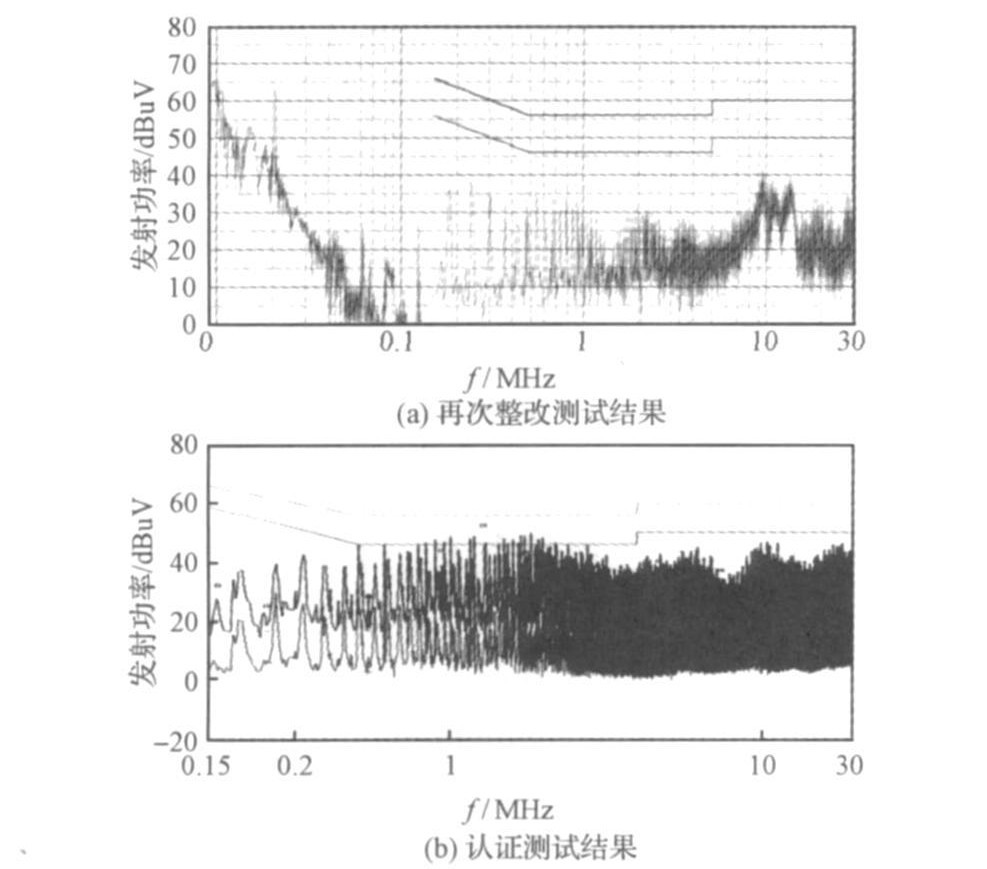 從預測試的結(jié)果圖7( a)中可以明顯地看出干擾信號幅值都比標準限值都要低6 dBuV 以上, 這樣基本能確保一次性通過認證機構(gòu)專用實驗室的檢測。由寧波進出口檢驗檢疫局EMC 實驗室提供的測試結(jié)果如圖7( b)所示。該結(jié)果表明產(chǎn)品已經(jīng)順利通過測試。