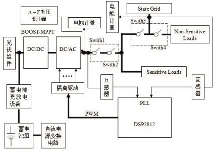正常工作時,開關Switch1、Switch2、Switch3、Switch4同時閉合,為當?shù)刎摵商峁╇娔?;當出現(xiàn)電網(wǎng)缺相、電壓嚴重跌落等非正常狀況時,由DSP檢測出異常情況,做出判斷決策,并控制開關的開通與0關斷。這時,開通Switch1和Switch2,關斷Switch3,保證重要負荷的供電。當逆變器發(fā)生故障時,立即斷開Switch1,逆變器退出,同時斷開Switch4,由電網(wǎng)對重要負荷供電。當逆變器故障消失時,在與電網(wǎng)同步后,開通Switch1,再閉合Switch4,恢復對當?shù)刎摵傻墓╇?。當需要檢修逆變器時,先斷開開關Switch2,檢修完成后,重新閉合Switch2。