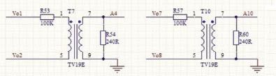 此系統(tǒng)輸出是三相交流電,輸出線電壓為380V,故選擇TV19E電壓互感器,其輸出負載電阻可以接0~500Ω,輸出交流電壓0~2.5V,此系統(tǒng)采用240歐的電阻,輸出電壓為-1.2V~1.2V。滿足DSP的輸入要求。電路如圖3所示。