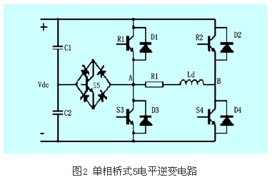 對圖1進行改進就可以得到5電平單相橋式逆變電路,如圖2所示。和圖1相比,多了一個電容,使負載輸出的電平數(shù)為5:vdc,-vdc,0,+vdc/2,-vdc/2。s5截止時其工作同單相全橋逆變電路,可輸出三電平;s5和s4(d4)導(dǎo)通時,uab=vdc/2; s5和s2(d2)導(dǎo)通時,uab=-vdc/2。