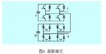 為了輸出更多的電平,減少隔離電源數(shù)量,每個單元電路結(jié)構(gòu)可以不完全相同,串聯(lián)單元本身還可以是一個多電平逆變器,如二極管箝位型逆變器,或飛跨電容箝位型逆變器。這種由不同結(jié)構(gòu)單元串聯(lián)而成的逆變器稱為混聯(lián)型逆變器,如圖5(b)所示。如果需要三相,則可以用三組這樣的混聯(lián)單元按照圖5(a)所示連接方法相連。實際中,由于級聯(lián)多電平主要用于高壓大功率,為了充分發(fā)揮不同類型器件的優(yōu)點(高壓和高頻),同一組(相)相串聯(lián)的不同的逆變單元中常常使用不同的器件,這種連接方式也稱為混聯(lián),如圖6所示,igbt和igct的混聯(lián)型逆變單元,igbt工作于相對較高的頻率,較低的電壓;而igct工作于相對較高的電壓,較低的頻率。