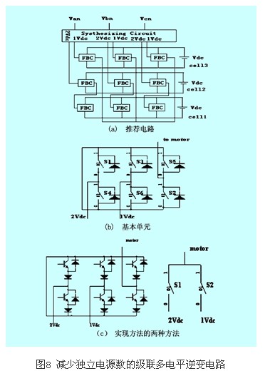圖8(a)為推薦的三相級聯(lián)逆變主電路,它只有三個獨立直流電源,每相根據(jù)各開關(guān)的不同組合可以產(chǎn)生+2vdc、-2vdc、+vdc或-vdc電平的電壓。圖中fbc為基本的h橋逆變單元。為了避免各直流電源短路,增加了一組合成電路(synthesizingcircuit)。合成電路基本模式如圖8(b)所示,具體實現(xiàn)由圖8(c)所示的兩種方法完成,s1和s2為雙向開關(guān)。