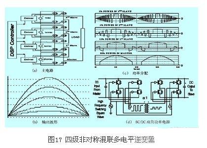 有些學(xué)者為非對稱混聯(lián)多電平逆變電路提出了主從逆變單元的概念。主逆變單元(master)就是串聯(lián)連接的逆變器中,直流電壓最高的單元,它承擔級聯(lián)逆變器大多數(shù)的功率,通常由gto、igct完成,同時通過dc/dc雙向功率電源向從逆變單元(slave)供電。其它的逆變單元稱為從逆變單元,直流電壓較低,只負責完成自己的逆變?nèi)蝿?wù)。圖17所示為(a)(b)(c)(d)分別為4級連接81電平的逆變器主電路、輸出波形、功率分配情況及dc/dc雙向功率電源。