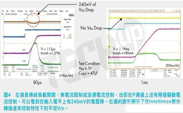 我們應(yīng)該更進(jìn)一步鉆研的下一代智慧型FET的特性是當(dāng)開(kāi)關(guān)關(guān)閉時(shí)會(huì)發(fā)生什么?採(cǎi)用離散P溝道的傳統(tǒng)負(fù)載開(kāi)關(guān)可以完全關(guān)閉并連接輸入至輸出,不管是重負(fù)載還是大電容載入在輸出腳上。如果這種情況發(fā)生,通常初級(jí)端輸入電平會(huì)顯示電壓突降,它可能影響與偏置電平相關(guān)聯(lián)的精密類比數(shù)位轉(zhuǎn)換器(ADC)或感測(cè)器。在過(guò)去,電阻/電容(R/C)網(wǎng)路添加至閘極以降低開(kāi)啟速度,但這會(huì)增加專案的設(shè)計(jì)時(shí)間和規(guī)模。Intellimax支援轉(zhuǎn)換速率控制特性,藉著在輸入端限制浪涌電流,可使電平中斷最小化。圖4顯示了此方案在實(shí)證研究的實(shí)驗(yàn)室測(cè)試中的一個(gè)例證。注意,左邊為採(cǎi)用傳統(tǒng)P溝道方法對(duì)Vin電平的影響,右邊的則是Intellimax器件的影響。