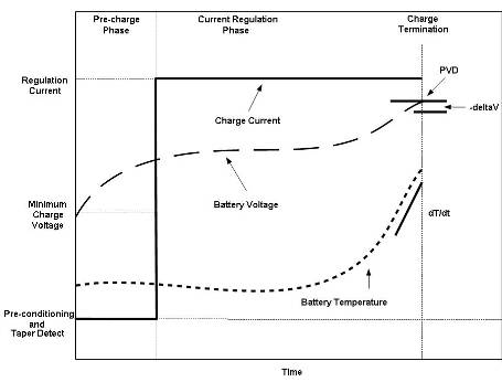 當電池溫度和電壓正確時快速充電開始。通常用 1C 或更低的恒定電流對 NiMH 電池進行充電。一些 NiCd 電池可以用高達 4C 的速率進行充電。采用適當?shù)某潆娊K止來避免有害的過充電。