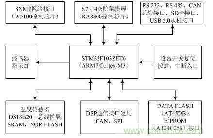 人機交互控制模塊是此IPS 設(shè)計中最為復雜的數(shù)字化管理模塊, 它不僅監(jiān)測和管理逆變系統(tǒng)的運作, 還要保證IPS 控制器與外界的通信。設(shè)計中要求人機交互模塊能處理復雜的任務(wù)調(diào)度和很強的突發(fā)訪問( 中斷) 處理, 這就必須有較高運行速度;模塊內(nèi)部還要有豐富的擴展接口提供IPS 與外部即時通信; 具備優(yōu)越的總線控制和訪問機制等。綜合考慮上述需求, 設(shè)計中選擇了意法半導體( ST ) 公司推出的最新32 位單片機STM32F103ZET6 ( 以下簡稱ST M32) 。ST M32 是基于ARM7 Co rtexM3 內(nèi)核架構(gòu)的高速高性能嵌入式控制芯片, 擁有72 MHz 內(nèi)核工作頻率和1. 25 DMIPS/ MHz的指令流水處理速度; 先進的總線結(jié)構(gòu)和多達16 級的帶DMA 功能搶占中斷機制( NIVC) [ 10] 。如圖3 所示,設(shè)計中ST M32 通過SCI 接口及1 根中斷請求/ 接收線與DSP 2808 進行通信; 利用片上擴展的其中2 個SCI 口分別作為RS 232 和RS 485通信協(xié)議口; CAN 總線接口和U SB 總線通過共享數(shù)據(jù)緩沖區(qū)和中斷向量入口與外界互聯(lián)通信;通過STM32 的26 位地址總線和16 數(shù)據(jù)總線擴展外掛256 KB SRAM 和4 MB N OR FLASH, 以及8 位數(shù)據(jù)口的LCM 模塊RA8806 以及用于SNMP 的16 位并行數(shù)據(jù)的以太網(wǎng)芯片W5100; 啟用ST M32 的SDIO 總線以啟用用戶插入SD 卡存儲查詢IPS 狀態(tài)數(shù)據(jù)功能; 啟用現(xiàn)場環(huán)境下獨立時鐘看門狗電路和STM32 特有的窗口看門狗;啟用內(nèi)部芯片溫度傳感器采樣監(jiān)控, RC時鐘源以及外部喚醒功能; 通過通用引腳接入DS18B20 溫度傳感器對環(huán)境溫度的采樣, 預留I2 C 方式E2PROM 和SPI 方式的DA TA FLASH 接口為產(chǎn)品后續(xù)升級開發(fā)做準備。