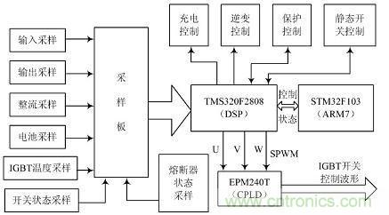該模塊是逆變信號產(chǎn)生及反饋檢測調(diào)整模塊, 核心是一片C2000 系列高性能DSP 處理器TMS320F2808(以下簡稱F2808) , F2808 產(chǎn)生的SPWM 信號經(jīng)過CPLD 進行邏輯延時移相形成三相逆變器IGBT 控制信號。F2808 是德州儀器( TI) 公司的一款高速DSP 芯片, 最高運行速度可達100 MIPS, 為適應(yīng)工控強干擾環(huán)境, F2808 內(nèi)部集成了增強型輸入捕獲單元( eCAP) 和帶死區(qū)控制功能的輸出比較PWM 產(chǎn)生單元( ePWM) ,12 位16 通道快速ADC 單元; 內(nèi)核支持用于定點DSP實現(xiàn)浮點運算的IQ 變換函數(shù)庫; 還有諸如SCI, SPI,eCAN 等豐富而通用的外設(shè)接口。如圖2 所示, 設(shè)計中F2808 的主要任務(wù)是監(jiān)控IPS 功率部分的開關(guān)狀態(tài)和動作, 根據(jù)逆變器和負載狀態(tài)反饋調(diào)整3 路SPWM波形的輸出,電池充電脈沖控制。DSP 輸出的3 路SPWM 信號直接送給CPLD,經(jīng)過CPLD 的等間隔脈沖延遲移相作為逆變器產(chǎn)生U, V, W 三相電的控制波形。