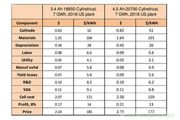Tesla公開說明選擇20700的優(yōu)勢(shì):“If the new meets the same life and safety requirements, once it is produced at the same yields and at high volume, it will offer about 3-4 % increase in energy density and a 7 % reduction in cost”,即在達(dá)到與18650同樣的良率和產(chǎn)能后,能帶來能量密度增加和成本下降兩個(gè)優(yōu)勢(shì),這從下表中也能得到充分體現(xiàn)。