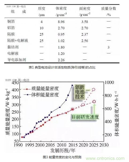 電池的能量密度基本由電池的正負(fù)極決定的,但光是正負(fù)極活性材料也不能保證電池能發(fā)上電,得有很多非活性物質(zhì),比如導(dǎo)電輔助劑、活性粉末之間的粘結(jié)劑、隔離膜、陰陽(yáng)極的箔材、絕緣固定的膠紙、外邊鋁塑膜殼子或者鋼鋁殼等等(表1 典型電池設(shè)計(jì)非活性物質(zhì)的占比)。我們的媒體,總喜歡搞大新聞,有意無(wú)意的忽略這部分物質(zhì)的含量,得出的能量密度老能高到天上去,與事實(shí)相差較大,誤導(dǎo)無(wú)辜吃瓜群眾。其實(shí),這部分相當(dāng)重要,就拿過(guò)去十幾年的技術(shù)進(jìn)步來(lái)說(shuō),我們電池的能量密度提升主要就是靠著活性物質(zhì)占比的提升來(lái)實(shí)現(xiàn)的。