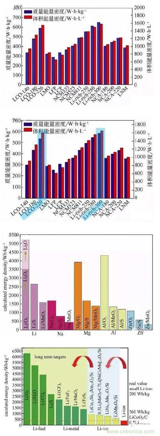 中科院的吳嬌楊博士對(duì)于選取了現(xiàn)有理論容量較高、理論容量較低但是商業(yè)化比較成熟等綜合性能比較好的正負(fù)極材料,進(jìn)行正負(fù)極搭配,大致得出了結(jié)果:Li-rich-300 對(duì)Si-C-2000 的電芯體系,在所有的電池體系中具有最高質(zhì)量能能量密度584 W·h/kg以及最高體積能量密度1645 W·h/L。該數(shù)值不包括封裝材料與極耳。