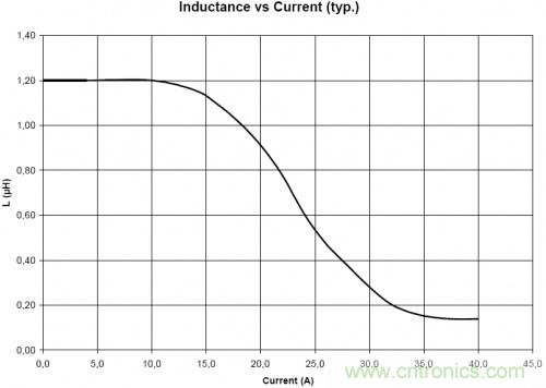 電感中直流電流的增加時,電感透磁率的數值會逐漸減少,因此電感值會緩慢下降。電感廠商會根據電感的電感值的下降程度為指標的額定電流,"基于電感值的變化率的額定電流",即Saturation Current,大部分電感廠商將電感值下降20%時的通過電感直流電流作為額定電流。下圖是Wurth公司某款電感的電感值vs電流的曲線圖。該款電感規(guī)格書上將saturation current設定為電感值下降10%時的電流值,為16.6A。如果將saturation current設定為電感值下降20%時的電流值的話,大約為18.2A。