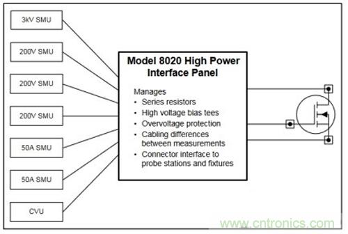 在對功率半導體器件執(zhí)行全面的DC I-V和C-V測試時,為減少遇到的問題,許多工程師采用高功率接口面板(圖3),最大限度地減少主要測量類型之間的連接變化??梢酝ㄟ^T型偏置進行I-V和C-V測量,而不需改變連接,從而減少用戶出錯的機會。