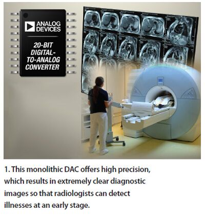 諸如MRI等成像設(shè)備的使用普及率在增加,目前全球每年要實施超過6千萬例MRI診斷。它們通常用于診斷阿爾茨海默氏癥(老年癡呆癥)、癌癥細胞和韌帶撕裂等各種疾病和損傷。成像系統(tǒng)采用了多種射頻/微波器件,包括振蕩器、發(fā)射器和天線。例如,ADI公司現(xiàn)在就提供一款為提高成像分辨率而設(shè)計的20位數(shù)據(jù)轉(zhuǎn)換器(DAC)AD5791。