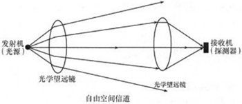 一個(gè)光無線通信系統(tǒng)構(gòu)成如圖1所示,包括三個(gè)部分:發(fā)射機(jī)、信道和接收機(jī)。光發(fā)射機(jī)的光源受到電信號(hào)的調(diào)制,并通過作為天線的光學(xué)望遠(yuǎn)鏡,將光信號(hào)經(jīng)過空間送到接收端的望遠(yuǎn)鏡。高靈敏度的光接收機(jī),將望遠(yuǎn)鏡收到的光信號(hào)再轉(zhuǎn)換成電信號(hào),值得注意的是,發(fā)送端和接收端之間,必須是互相視線可見的,兩終端之間不能有阻擋。由于大氣空間對(duì)不同光波長(zhǎng)信號(hào)的透過率有較大的差別,可以選用透過率較好的波段窗口。光無線系統(tǒng)通常使用0.85μm或1.5μm紅外波段。0.85μm的設(shè)備相對(duì)便宜,一般應(yīng)用在傳輸距離不太遠(yuǎn)的場(chǎng)合。1.5μm的設(shè)備價(jià)格要高一些,但在功率、傳輸距離和視覺安全方面有更好的表現(xiàn)。 1.5μm的紅外光波大部分都被角膜吸收,照射不到視網(wǎng)膜,因此,相關(guān)安全規(guī)定允許1.5μm波長(zhǎng)設(shè)備的功率可以比0.85μm的設(shè)備高2個(gè)等級(jí),1.5μm波長(zhǎng)的光無線通信具有更廣闊的使用前景。