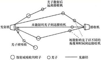 對(duì)天氣非常敏感是FSO的另一個(gè)主要問題。晴天對(duì)FSO傳輸質(zhì)量的影響最小,而雨、雪和霧的影響較大。據(jù)測(cè)試,F(xiàn)SO 受天氣影響的衰減經(jīng)驗(yàn)值分別為:晴天,5~15dB/km;雨天,20~50dB/km;雪天,50-150dB/km;霧天,50~300dB/km。可見影響最大的是霧天,這是因?yàn)殪F中的散射粒子的半徑與激光的波長(zhǎng)在同一數(shù)量級(jí)上,而且散射粒子非常集中,從而使光線的傳播方向發(fā)生偏轉(zhuǎn),造成空間、角度和時(shí)間上的擴(kuò)展,如圖2。對(duì)于這種大氣現(xiàn)象處理的方式,與微波通信中對(duì)待雨衰相似。要在系統(tǒng)傳輸?shù)挠?jì)算中,為光信號(hào)的衰減留有足夠的系統(tǒng)功率余量,以便在出現(xiàn)濃霧最大衰減的情況下,仍能接收到所需的光信號(hào)功率。重要的是,要獲得所在地長(zhǎng)期的氣象統(tǒng)計(jì)資料,能夠知道不同等級(jí)(能見度)的霧,即不同衰減的大氣介質(zhì)出現(xiàn)的統(tǒng)計(jì)規(guī)律。如果了解到衰減值大于某一指標(biāo)出現(xiàn)的概率,就能確定光無線系統(tǒng)為了保證可用性的指標(biāo)(比如99.9%),需要容納多大的大氣損耗。而傳輸距離的計(jì)算公式如式(1)所示。