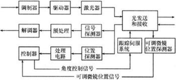 隨著通信技術(shù)的發(fā)展,對(duì)FSO系統(tǒng)的傳輸速率和距離均提出了更高的要求,如果要提高這兩個(gè)技術(shù)指標(biāo),就必須要增大激光器的發(fā)射功率和提高接收機(jī)的靈敏度,但擴(kuò)束法和多束法對(duì)性能指標(biāo)的改善有限,于是動(dòng)態(tài)跟蹤法就應(yīng)運(yùn)而生,即利用伺服系統(tǒng)通過反饋裝置獲得光束偏差信息,調(diào)整可調(diào)微鏡,使光束時(shí)刻對(duì)準(zhǔn)接收器。采用動(dòng)態(tài)跟蹤技術(shù)的FSO系統(tǒng)設(shè)備功能結(jié)構(gòu)如圖3所示,一般采用雙反饋方式,外反饋是位置探測(cè)器輸出的入射激光束的位置誤差信號(hào),內(nèi)反饋是伺服系統(tǒng)控制的可調(diào)微鏡的位置信號(hào),入射激光束通過接收光學(xué)系統(tǒng)后,聚集到位置探測(cè)器上,位置探測(cè)器將激光束的位置誤差信號(hào)輸出到主處理器。同時(shí)可調(diào)微鏡位置探測(cè)器將探測(cè)到的微鏡位置信號(hào)送到控制處理器中,控制處理器利用優(yōu)化的跟蹤算法進(jìn)行計(jì)算,輸出的角度控制信號(hào)控制伺服系統(tǒng)調(diào)整可調(diào)微鏡,使接收光學(xué)系統(tǒng)始終對(duì)準(zhǔn)入射激光束。
