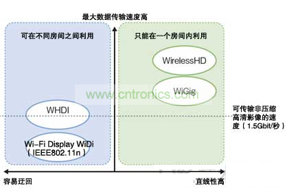 Wi-Fi Display、WiDi和WHDI因電波比較容易迂回,適用于在不同房間的連接,采用60GHz頻帶毫米波的WirelessHD和WiGig雖然可以確保傳輸速度,但如果有障礙物的話,電波難以到達(dá),因此主要在一個(gè)房間內(nèi)使用。