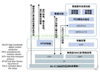 Wi-Fi Display是以無(wú)需經(jīng)由WLAN接入點(diǎn)即可在終端間直接通信的標(biāo)準(zhǔn)“Wi-Fi Direct”為基礎(chǔ),由上層的協(xié)議棧軟件構(gòu)成的安裝指南。鎖定終端服務(wù)的“服務(wù)發(fā)現(xiàn)(Service Discovery)”等的處理利用Wi-Fi Direct進(jìn)行,影像的壓縮/解壓處理及管理數(shù)據(jù)流的傳輸層等利用Wi-Fi Display處理(圖2)。壓縮/解壓采用H.264格式。由于最近的智能手機(jī)不但標(biāo)配WLAN功能,采用內(nèi)置H.264編解碼器電路GPU的終端也很多,因此Wi-Fi Display還具有易于配備到終端中的特點(diǎn)。“在受限于安裝面積和耗電量的智能手機(jī)中,無(wú)需追加硬件即可配備的優(yōu)勢(shì)非常大”(Cavium公司的柴田)。