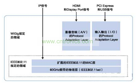 WiGig雖然是最后出現(xiàn)的,但作為非壓縮方式的有力候補(bǔ),其存在不容忽視。WiGig在60GHz頻帶的物理層及擴(kuò)展了IEEE802.11的MAC層上,規(guī)定了處理HDMI和Display-Port等信號(hào)的擴(kuò)展標(biāo)準(zhǔn)(圖4)。MAC層之所以與IEEE802.11標(biāo)準(zhǔn)確保了向后兼容,是因?yàn)樵O(shè)想了在平時(shí)使用WLAN,只在傳輸影像等時(shí)使用60GHz頻帶等用途。WiGig Alliance與Wi-Fi Alliance共同制定了認(rèn)證計(jì)劃等,WiGig將來(lái)還有可能會(huì)與WLAN整合。