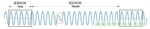 數(shù)字示波器捕獲信號的過程是典型的“采集-處理-采集-處理”過程,如圖1所示為數(shù)字示波器的采集原理,一個捕獲周期由采樣時間和(處理時間)死區(qū)時間組成,如圖2所示。