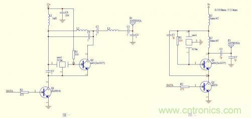 兩電路基本原理一致,都是由0、1信號控制實現(xiàn)高頻脈沖發(fā)射的電路,工作頻率由晶振決定,從穩(wěn)定性上分不出優(yōu)劣。圖二電路簡潔,稍容易調(diào)試些,圖一在三極管集電極與電源間加了選頻網(wǎng)絡(luò),在三極管集電極與天線之間也加了選頻網(wǎng)絡(luò),輸出頻率更純凈,但調(diào)試要麻煩些。再一點區(qū)別是圖二上方三極管的基極通過電阻引入了交流負(fù)反饋,其實這對該電路穩(wěn)定性的影響也并不明顯。電源上對地的高頻電容還是保留為好,但圖二中沒有畫出。