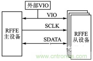 RFFE是MIPI聯(lián)盟針對(duì)射頻前端設(shè)備所提出的控制規(guī)范。單個(gè)總線上可以掛載1個(gè)主機(jī),同時(shí)最多掛載15個(gè)從機(jī)。該總線使用2條信號(hào)線,一條是主機(jī)控制的時(shí)鐘線SCLK,另一條是雙向數(shù)據(jù)線SDATA,此外還有一條參考電壓線VIO。VIO可由主機(jī)提供,也可由外部提供。SCLK的標(biāo)準(zhǔn)頻率是32kHz-26MHz,擴(kuò)展頻率是26MHz-52MHz,在空閑時(shí)SCLK和SDATA保持低電平。