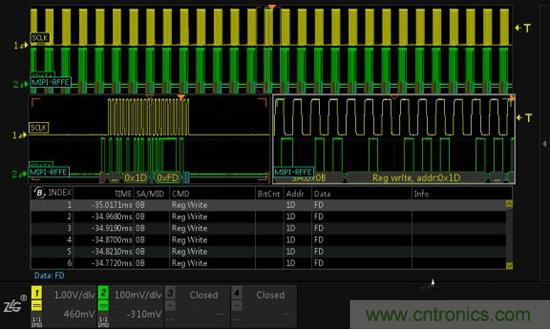 圖3為RFFE的通信例程,使用ZDS4054分析總線非常簡單,將示波器探頭分別接在SCLK和SDATA線上,將總線通信數(shù)據(jù)采集回來,然后開啟MIPI-RFFE協(xié)議解碼,簡單設(shè)置參數(shù)后,即可完成協(xié)議分析。