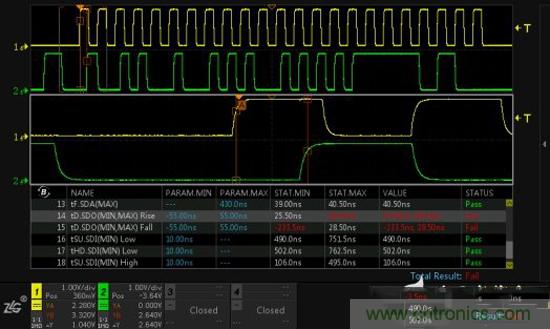ZDS4000同時(shí)具備強(qiáng)大的時(shí)序分析功能,在Analyze中使能MIPI-RFFE時(shí)序分析,依靠我們具有的完整測(cè)試項(xiàng)目,可迅速找出時(shí)序中可能存在的問題與風(fēng)險(xiǎn)。如圖5發(fā)現(xiàn)的數(shù)據(jù)有效時(shí)間測(cè)試不通過,只需選中該項(xiàng)后輕輕一按B旋鈕,就可立即定位到測(cè)試不通過所在的位置。
