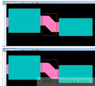 設計用于射頻和微波的銅箔形狀時,一個很重要的方面是能夠建立帶尖拐角的 Gerber檔。優(yōu)秀的PCB設計工具可以簡化這一過程。例如,使用50毫米線條繪制形狀與使用50毫米圓形光圈繪圖相比,往往令設計具有較小的半徑。設計工具在建立Gerber檔時,可透過正確地自動轉換線條寬度來獲得尖拐角(圖 2)。