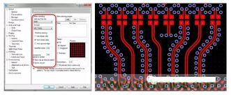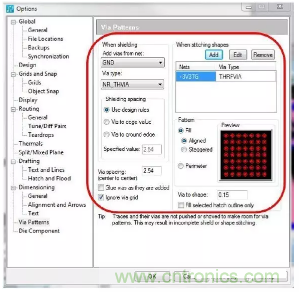 圖 5:利用支持射頻設計的PCB設計工具,您可以設定用于產(chǎn)生via模式的設計規(guī)則,并自動在您的設計中強制實施這些規(guī)則,從而節(jié)省您的時間和確保符合您的所有設計規(guī)則。