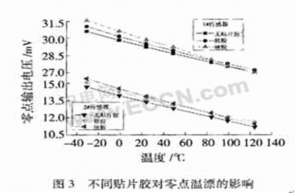 從圖3可以看出,貼片膠對(duì)傳感器零點(diǎn)的影響隨溫度變化而變化,在低溫時(shí),使用了硬膠貼片的傳感器的零點(diǎn)明顯高于使用軟膠與無(wú)膠的,這種差別隨著溫度的升高變得越來(lái)越小。這主要有三個(gè)原因:①貼片膠的彈性模量隨溫度的升高而變小;②貼片膠高溫固化,在低溫時(shí)會(huì)引起收縮殘余應(yīng)力;③貼片膠和芯片材料熱膨脹系數(shù)不同產(chǎn)生的熱應(yīng)力。特別需要注意的是,在85℃之后,硬膠的影響突然變小,小到幾乎與無(wú)膠的情況相同。這是因?yàn)橛材z的玻璃化溫度(Tg)為85℃,高于Tg點(diǎn)時(shí)膠的楊氏模量變小,因而對(duì)傳感器的零點(diǎn)溫漂影響變小。因此,在選用貼片膠時(shí),要求膠的Tg大于傳感器的工作溫度,以確保傳感器零點(diǎn)的穩(wěn)定性和工作的可靠性。
