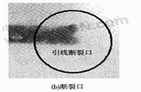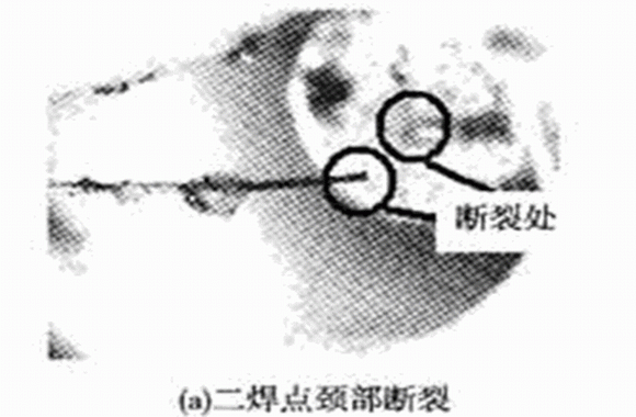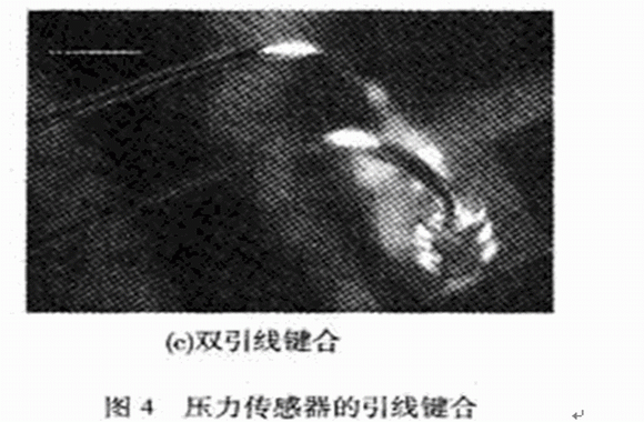 用于引線(xiàn)鍵合的鍵合線(xiàn)有Al線(xiàn)和Au線(xiàn),由于Au線(xiàn)性能更優(yōu),所以壓力傳感器的鍵合工藝選用Au線(xiàn)。鍵合時(shí)要使鍵合面保持清沽,否則會(huì)影響鍵合強(qiáng)度,等離子清洗是一種能有效提高鍵合強(qiáng)度的方法。由于機(jī)油壓力傳感器工作環(huán)境惡劣,尤其是頻繁的振動(dòng)會(huì)導(dǎo)致金絲有缺陷的地方疲勞斷裂,或者最容易疲勞的位置如第二焊點(diǎn)附近的頸部位置發(fā)生斷裂,因此要求更高的鍵合質(zhì)量。曾對(duì)所研制的機(jī)油壓力傳感器進(jìn)行了臺(tái)架試驗(yàn),在一批試驗(yàn)樣品中經(jīng)過(guò)6×105次加壓和卸壓試驗(yàn)之后,發(fā)現(xiàn)有兩個(gè)樣品失效,故障分析結(jié)果表明:一個(gè)樣品的失效模式為信號(hào)處理電路上的一個(gè)電阻損壞;另一個(gè)樣品的失效模式為金絲線(xiàn)斷裂,如圖4(a),(b)所示。對(duì)于這種情況,可以采用雙金絲鍵合工藝,并盡量選用高純度、低缺陷的金絲,并做好引線(xiàn)鍵合前各封裝器件的清潔工作,如圖4(c)所示。這樣對(duì)金絲鍵合工藝進(jìn)行改進(jìn)后,在可靠性試驗(yàn)中,未曾出現(xiàn)金絲斷裂的質(zhì)量問(wèn)題。
