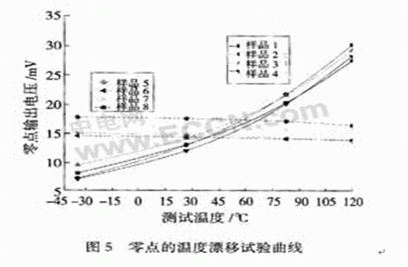 由于芯片對(duì)所處環(huán)境的要求比較特殊,所以與硅芯片接觸的硅油需要具備以下特點(diǎn):良好的介電性能、盡可能小的熱脹系數(shù)、化學(xué)穩(wěn)定性好以及耐熱和耐寒性能好。硅油的凈化處理是薄膜隔離式壓力傳感器封裝中至關(guān)重要的工藝步驟,因?yàn)槿魞艋桓蓛?,硅油或傳感器受壓部分的充油腔?nèi)就會(huì)混有氣體、水分等可壓縮、易揮發(fā)的物質(zhì),在全溫區(qū)內(nèi)的體積變化就會(huì)沒(méi)有規(guī)律可言,造成外界的待測(cè)壓力不能準(zhǔn)確、規(guī)則地傳遞到芯片,從而使得壓力傳感器的溫漂比較嚴(yán)重。這種現(xiàn)象反映在零點(diǎn)的溫漂上,可以用來(lái)評(píng)價(jià)封裝的好壞。通常,由于在恒壓源激勵(lì)的情況下壓力傳感器的靈敏度溫度系數(shù)為負(fù)值,所以壓力傳感器的零點(diǎn)稍有下降,如圖5的樣品5,6,7,8所示;而硅油凈化不充分的壓力傳感器零點(diǎn)的溫漂卻非常大,且隨著溫度的升高而升高,如圖5中的樣品1,2,3,4所示。試驗(yàn)表明,像樣品1,2,3,4這類(lèi)溫漂很大的傳感器的溫度補(bǔ)償是比較困難的,所以封裝時(shí)必須確保硅油品質(zhì)和填充量恰到好處。