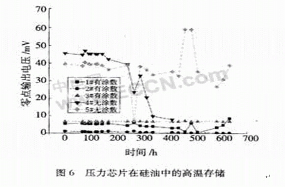 1#,2#,3#涂敷了保護(hù)層,4#,5#沒(méi)有涂敷保護(hù)層。可以看到,沒(méi)有保護(hù)層的傳感器在高溫下存儲(chǔ)了約200 h后,它的零點(diǎn)突然發(fā)生了變化,之后數(shù)據(jù)不穩(wěn)定;涂了保護(hù)層的壓力傳感器的零點(diǎn)在600多小時(shí)后仍然很穩(wěn)定。因此,為了防止硅油的污染導(dǎo)致壓力傳感器的失效,我們采取了一些必要的措施。首先,選擇高溫下盡可能穩(wěn)定的硅油;其次,盡量選擇具有良好鈍化層的芯片;最后,在不影響靈敏度的前提下,還可以在封裝過(guò)程中對(duì)芯片以及引線(xiàn)進(jìn)行涂敷鈍化層的處理。