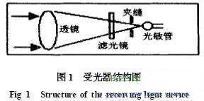 光電傳感器以光為媒介進(jìn)行無(wú)接觸檢測(cè)。光是一種頻率很高的電磁波[1]。光干擾也算是一種電磁干擾,光干擾是傳感器誤動(dòng)作的主要因素之一。環(huán)境光、背景光和周?chē)渌怆妭鞲衅靼l(fā)出的光是光干擾源。以紅外線為媒介進(jìn)行檢測(cè)則可減小可見(jiàn)光的影響,紅外光也不影響可見(jiàn)光。紅外線光電傳感器可用濾光鏡濾去可見(jiàn)光。對(duì)于周?chē)h(huán)境其它光電傳感器的光干擾,可用外殼、套筒、夾縫來(lái)抑制[2]。圖1是一種受光器結(jié)構(gòu)圖。