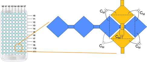 電容感測(cè)含有數(shù)個(gè)層:頂層是玻璃或塑膠材質(zhì),接者依序是一個(gè)光學(xué)透明膠(OCA)層、觸控感測(cè)器及平面液晶顯示器(LCD)。觸控感測(cè)器是由許多感測(cè)元件所排列而成的網(wǎng)格,尺寸通常為5毫米×5毫米。
