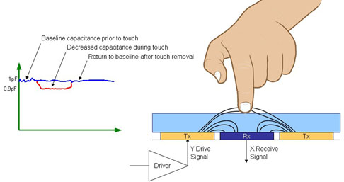 大部分的智慧型手機(jī)觸控螢?zāi)欢寄軐?duì)手指電容產(chǎn)生反應(yīng),觸控螢?zāi)粌?nèi)有許多排列整齊的感測(cè)器,會(huì)偵測(cè)出因手指移動(dòng)所導(dǎo)致的電容變化。當(dāng)你的手指觸碰到螢?zāi)粫r(shí),就會(huì)影響這些感測(cè)器的自容(Self-capacitance),以及彼此之間的互容(Mutual Capacitance)。大多數(shù)智慧型手機(jī)都是感測(cè)互容而不是自容。由于互容是反映一對(duì)感測(cè)器之間的互動(dòng)關(guān)系,因此可用來收集有關(guān)螢?zāi)簧厦總€(gè)位置的資訊(X×Y個(gè)感測(cè)點(diǎn));自容則僅能用來偵測(cè)每個(gè)感測(cè)器的反應(yīng)(X+Y個(gè)樣本),而不是每個(gè)點(diǎn)。