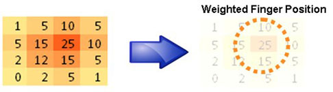 當(dāng)感測(cè)到的電容減去基準(zhǔn)值時(shí),就得到一個(gè)訊號(hào)值陣列,代表圖3所示的手指觸碰狀況。有許多種方法可根據(jù)這項(xiàng)資訊來判斷手指的位置,其中最簡單的方法是計(jì)算質(zhì)心--質(zhì)量中心(Centriod),計(jì)算出一維或二維軸向感測(cè)數(shù)值的加權(quán)平均值。運(yùn)用一維質(zhì)心計(jì)算法,根據(jù)上述例子的X軸數(shù)據(jù),可算出(5×1+15×2+25×3+10×4)/(5+15+25+10)=150/55= 2.73。接著以液晶螢?zāi)坏慕馕龆葹闃?biāo)準(zhǔn),將這個(gè)位置值適當(dāng)?shù)乜s放,以便和螢?zāi)恢丿B。若ITO感測(cè)器的圖案超出液晶螢?zāi)坏倪吘?,則必須進(jìn)行一些轉(zhuǎn)換計(jì)算。