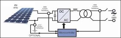 通常在剛好在PV 方陣后使用最大功率點(diǎn)跟蹤(MPPT)組件來(lái)確保方陣工作在其最大功率運(yùn)行水平。通過(guò)使用用于跟蹤功能的電流和電壓傳感器,應(yīng)用一種特殊軟件算法和專(zhuān)用電子元件一起來(lái)控制電池板(電池)的工作點(diǎn)。一般來(lái)說(shuō),一臺(tái)電流傳感器可用于測(cè)量單相輸出(供到電網(wǎng)的電流),而另一臺(tái)傳感器可用于測(cè)量輸入直流電流(10-25A)。在三相輸出的情況下,兩臺(tái)傳感器可用于測(cè)量三相輸出的交流電流。接入電網(wǎng)的DC/AC逆變器是一臺(tái)將直流信號(hào)轉(zhuǎn)換為正弦波的全橋逆變器。