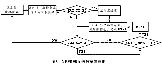 在現(xiàn)代無線通信中,數(shù)據(jù)都是以數(shù)據(jù)包的方式來進(jìn)行傳輸?shù)?對NRF9E5這樣的無線片上系統(tǒng),每次發(fā)送和接收數(shù)據(jù)也是以數(shù)據(jù)包的方式進(jìn)行的.數(shù)據(jù)包格式是通信協(xié)議的重要部分,NRF9E5的無線數(shù)據(jù)包格式有:Preamble、ADDR、PAYLOAD、CRC.其中,Preamble是前導(dǎo)碼,由硬件自動加上去;ADDR則發(fā)送32~40位地址碼;PAYLOAD是有效數(shù)據(jù)(最大為32bit);CRC是循環(huán)冗余碼校驗(yàn)和,可以由內(nèi)置CRC糾檢錯(cuò)硬件電路自動加上,可設(shè)為0位、8位或16位.傳感器節(jié)點(diǎn)最重要的工作就是將采集到的數(shù)據(jù)發(fā)送出去.要實(shí)現(xiàn)數(shù)據(jù)的無線發(fā)送,必須使處理器中的無線收發(fā)器工作在發(fā)送模式下.NRF9E5的收發(fā)器(NRF905)共有3種工作模式:ShockBurst接收(RX)方式、Shock Burst發(fā)送(TX)方式和節(jié)能方式,其發(fā)送數(shù)據(jù)流程如圖3所示.