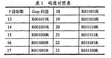 編碼采用格雷碼(Gray)為數(shù)值碼,以某一固定碼寬為參考碼R,它用于標尺定位和提高精度。Gray碼是一種絕對編碼方式的無權(quán)碼,它所具有的循環(huán)、單步特性能消除隨機取數(shù)時出現(xiàn)重大誤差的可能,其任意兩個柏鄰整數(shù)之間轉(zhuǎn)換時,只有一個位數(shù)發(fā)生變化,大大減少了由一個狀態(tài)轉(zhuǎn)到下一個狀態(tài)時的邏輯混淆,具有較強的容錯能力。以6位編碼為例,其部分十進制數(shù)與Gray碼的一一對應(yīng)關(guān)系如表1所示。